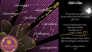 In this class we explore the Clairs are you clairvoyance (clear seeing) clairaudience ( clear hearing) and the other 5. You will be guided through a meditation where you will dive deep into the Clair’s and take time after to write down your experience . Then we will do a few exercises that show how your strongest gift works for you. $22 per person